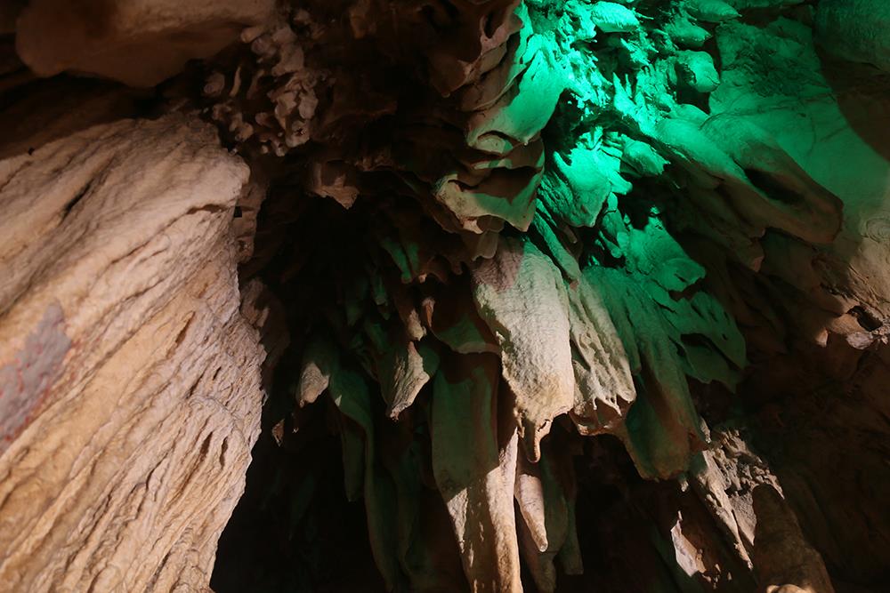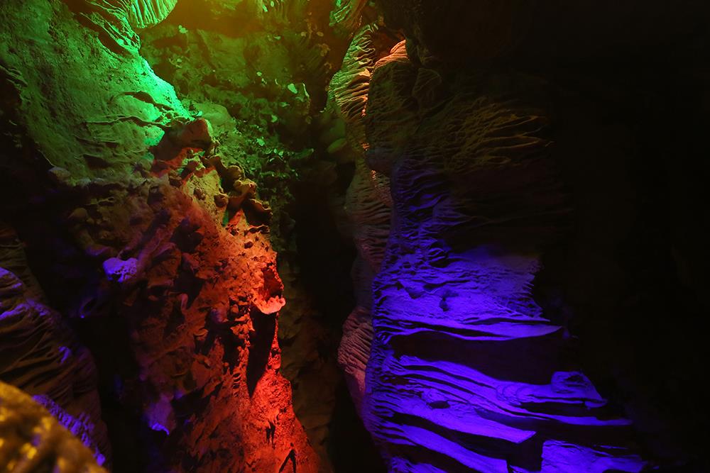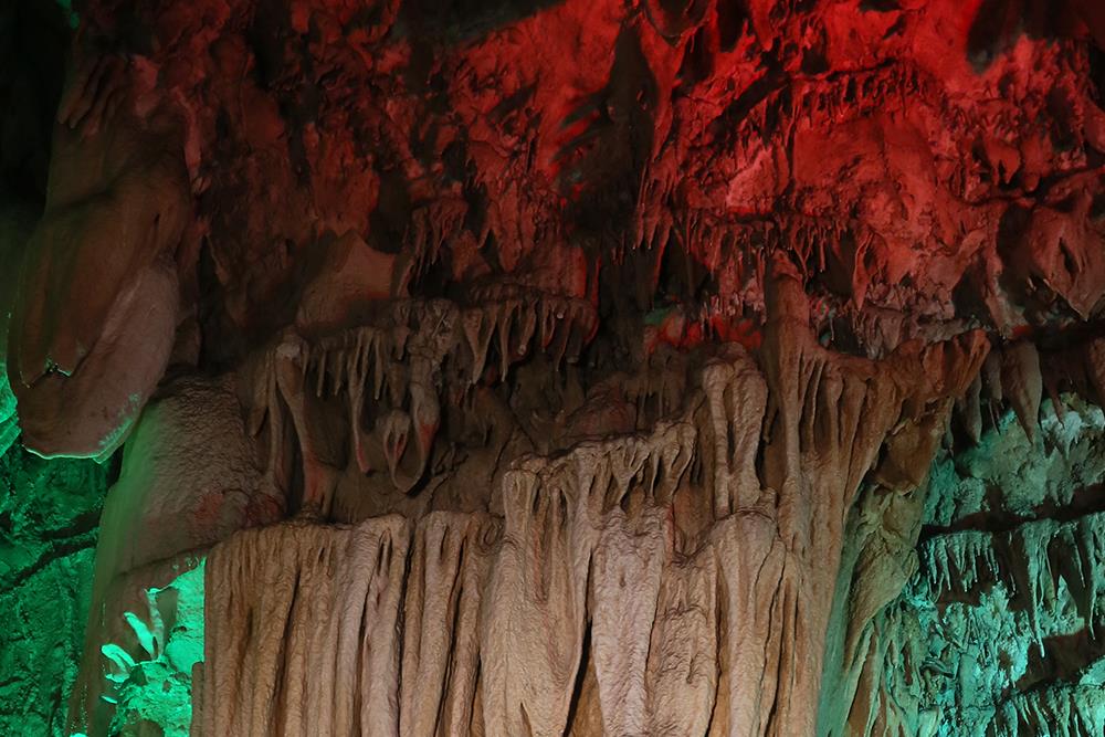 壮观的玉帘飞瀑,古诗云:“君不见黄河之水天上来,奔流到海不复回”你看这多么像黄河的壶口瀑布。相传这是玉皇大帝的门帘被风吹落人间。其实,这是含重碳酸钙的水顺岩壁流淌而下,水分蒸发,碳酸钙还原沉积而生成的。在这我们是不是禁不住要感叹大自然的鬼斧神工。